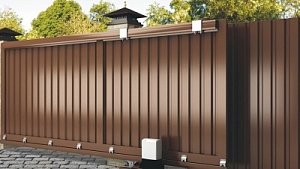 Бесшумность функционирования может обеспечиваться с помощью полимерной зубчатой рейки. В этом случае петли Fapim с тремя секциями надежно держат створки и они практически совсем не провисают. Что касается калитки, то туда монтируется врезной замок, имеющий нажимные ручки и устройство электрической защелки, действующей на ответных планках.